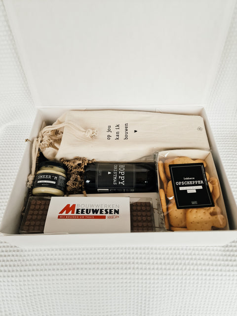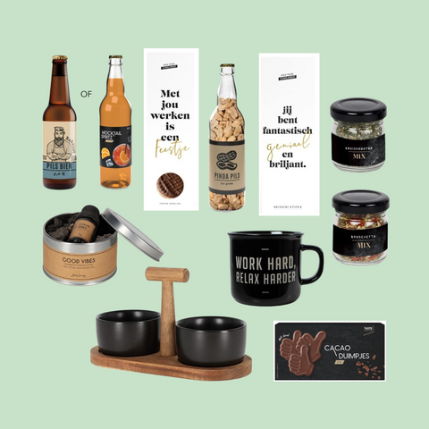 Met onze gifts brengen we jouw boodschap tot bij de ontvanger van je cadeaubox. Hoe we dat doen? Door de juiste combinatie van en de teksten op onze producten en door het gebruik van jouw logo en kaartje.